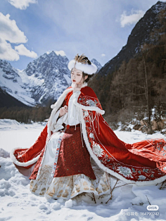 ❷ 浓烈撞色系 → 正红斗篷+雪景形成视觉冲击,内搭浅杏色竖领长袄平衡色彩,灵感源于《大明宫词》太平公主雪中舞剑名场面。